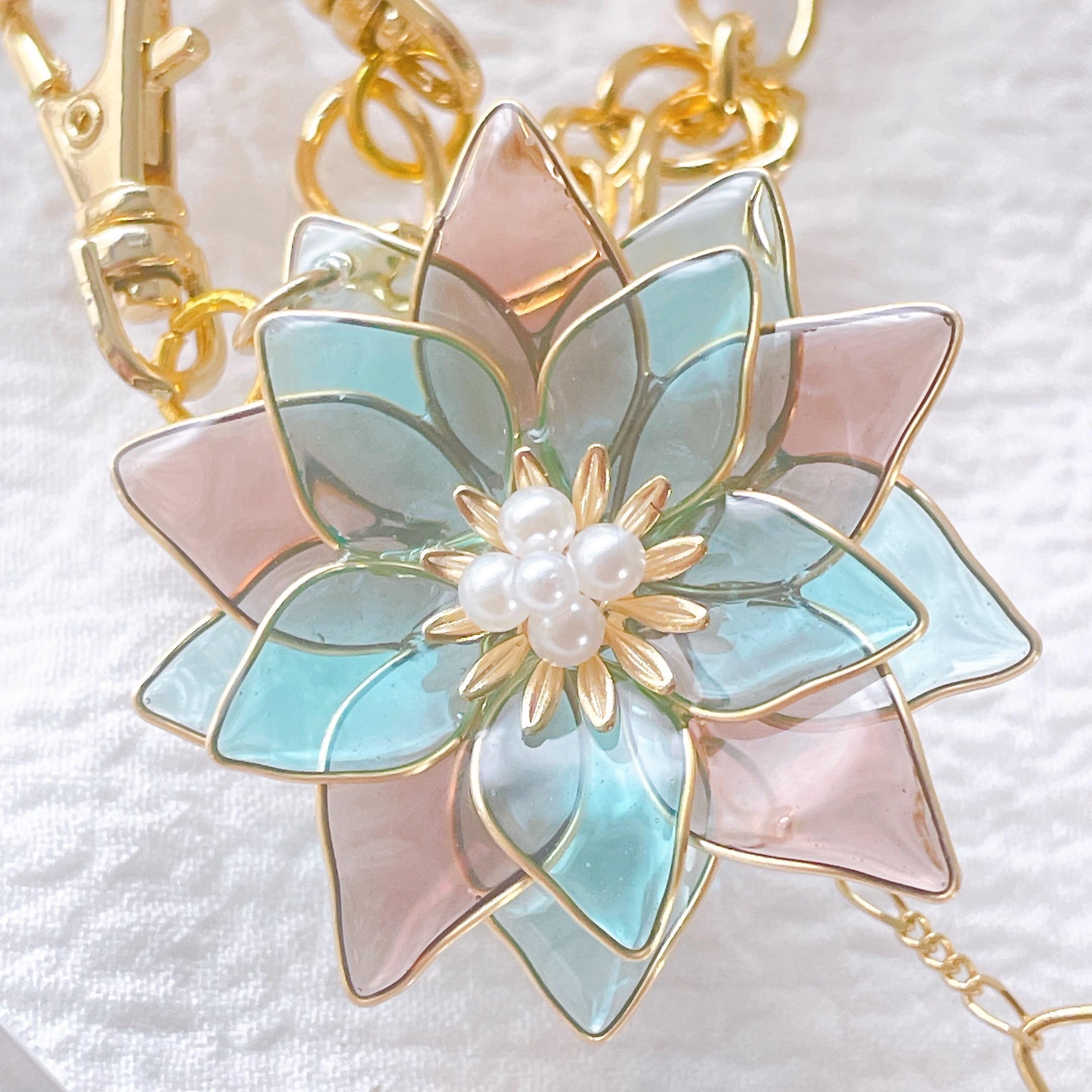 素材:ステンレスワイヤー、レジン、真鍮パーツ、プラスチックパール、ガラスビーズ